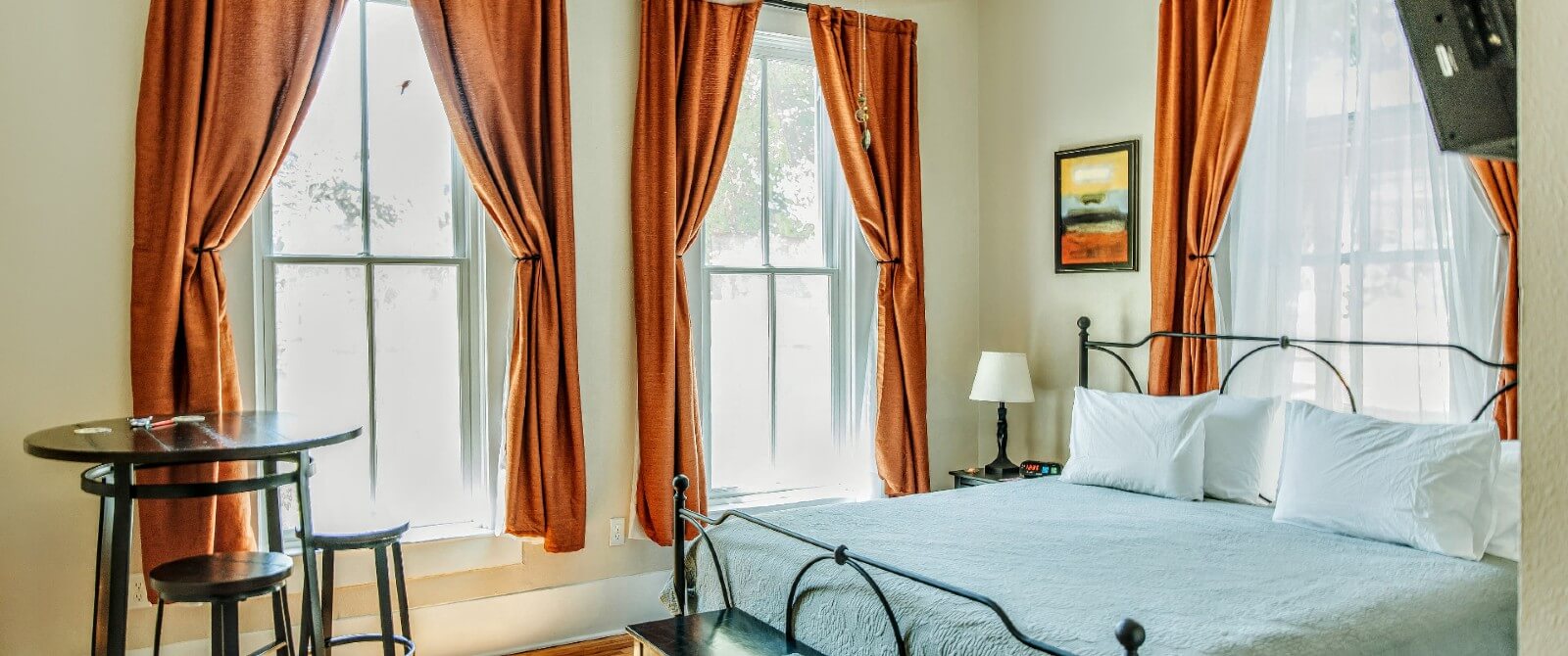 Eagle Peak room with windows, king bed, table, hardwood floors